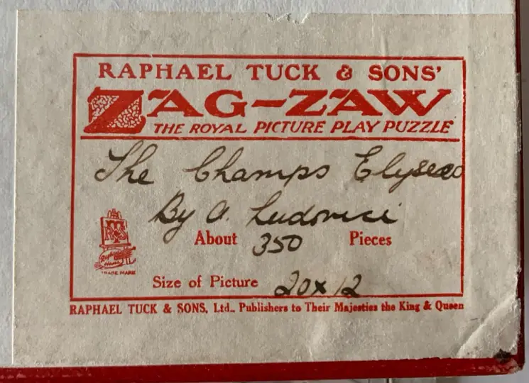 Zag-Zaw line of puzzles was first produced in 1909, most incorporate figurals or whimsies, sold in red, orange, or occasionally green boxes with labels on the side or bottom of the box, most without guide pictures. Initially cut non-interlocking but by 1930's became more so. Puzzles have a different cuts so that the same image will come in several versions which means that missing pieces can not be taken from other puzzles with the same image. The puzzle labels are often hand written and come with minor variations in titles and details. Some have a DESIGN category on the label. From my readings this refers to the style of cut, wavy lines, figurals, etc. See also Bob Armstrong's website on old jigsaw puzzles