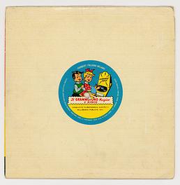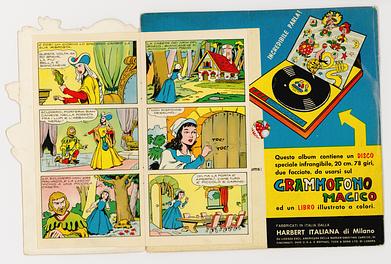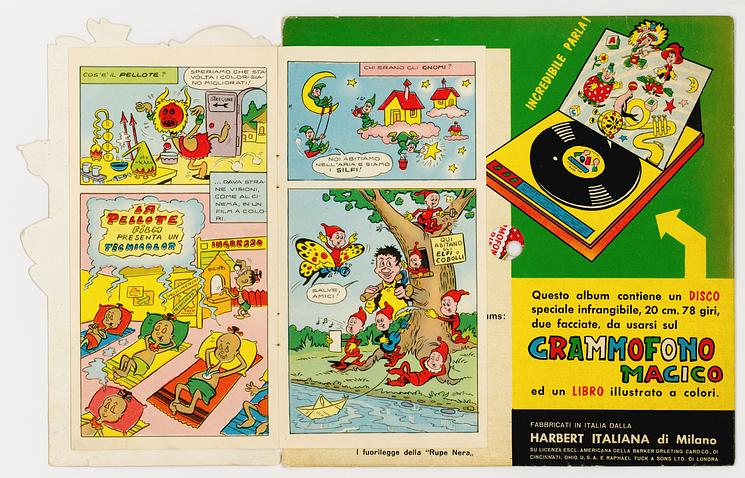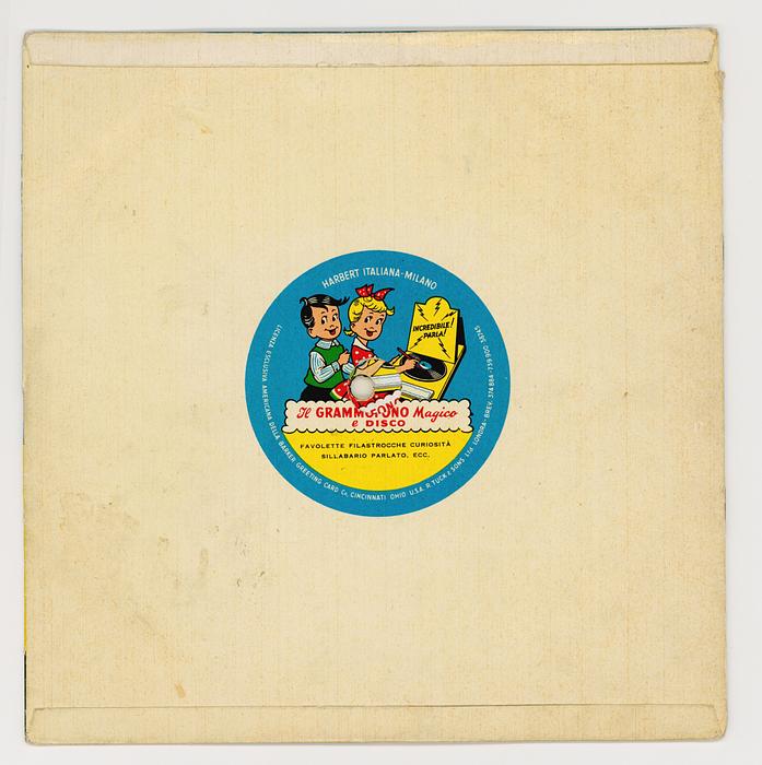 translated to THIS ALBUM CONTAINS A SPECIAL UNBREAKABLE, 20 CM, 78 RPM, DOUBLE-SIDED DISC FOR USE ON THE MAGIC GRAMOPHONE AND A COLOR ILLUSTRATED BOOK.