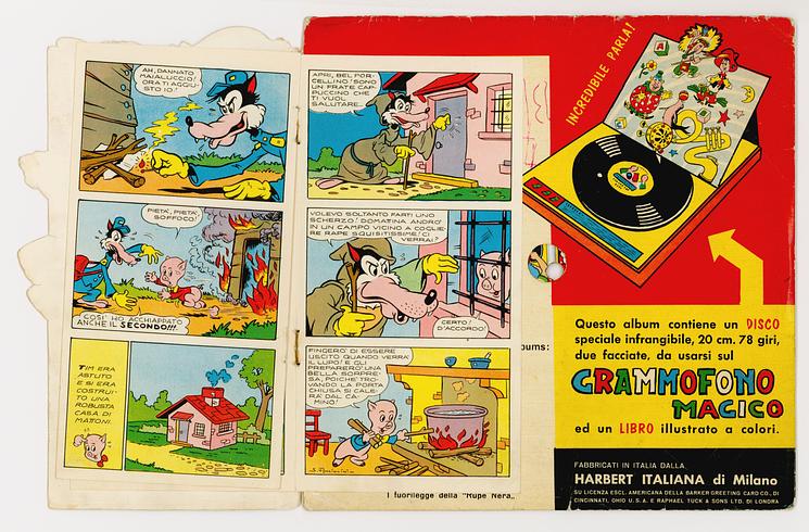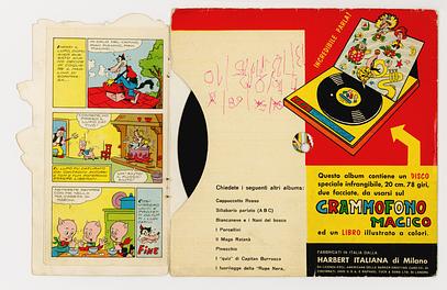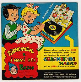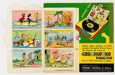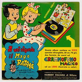 QUESTO ALBUM CONTIENE UN DISCO SPECIALE INFRANGIBLED, 20 CM, 78 GIRI, DUE FACCIATE, DA USARI SUL GRAMMOFONO MAGICO ED UN LIBRO ILLUSSTTRO A COLORI.