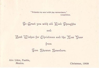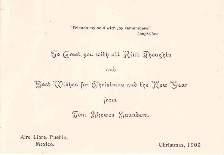 inside right:TIME AND TIDE BRING EVER HAPPY DAYS below: CHRISTMAS GREETINGS AND ALL GOOD WISHES FOR THE COMING YEAR -- FROM or "FRIENDS MY SOUL WITH JOY REMEMBERS." LONGFELLOW with personalized inscription CHRISTMAS 1909