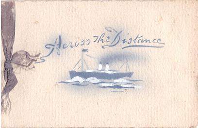 single fold, cover & inner sheet secured by ribbon, deckle edged, hand painted but not so tradenamed poem inside right in red: FOR THEE. WITH GREETINGS OF NEW YEAR AND OLD, I BRING THEE WISH FOR JOYS UNTOLD ....FOR SOUL FINDS NO RESTING -- PLACE, EXCEPT IT BE BY HEAVEN'S GRACE. *** JANUARY 1912
