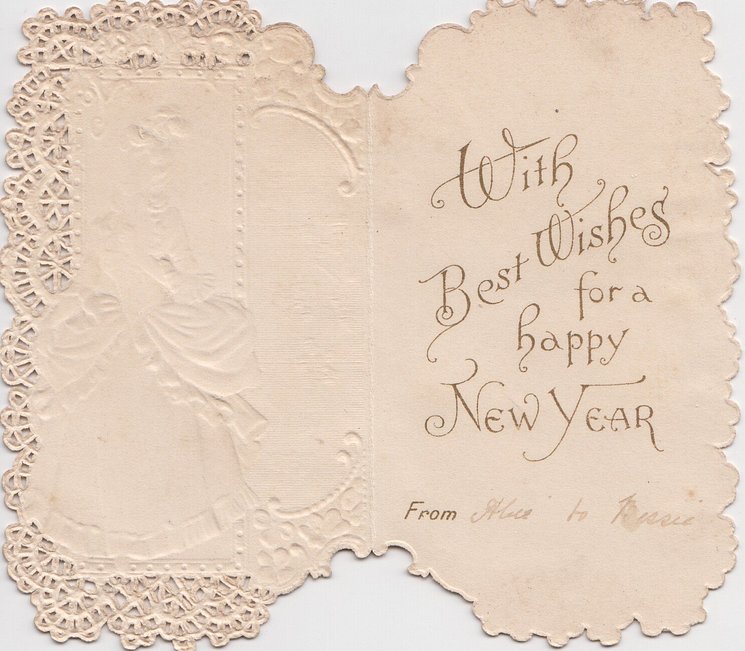 die-cut single sheet, single fold, serrated scalloped edges inside right:- JUST TO SAY I'M WISHING YOU ALL THAT'S BRIGHT AND GAY, JUST TO SAY I HOPE YOU'LL HAVE A HAPPY NEW YEAR'S DAY; BRIMFUL OF MIRTH AND PLEASURE BEYOND HOPE, ON FANCY'S MEASURE. FROM -- FROM