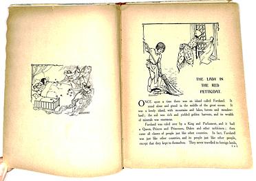 first story is THE LADY IN THE RED PETTICOAT colour plate is WAITING THEIR TURN pictorial board front cover with advert for other GOLDEN GIFT series books on the back cover