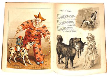 cover illustration of a clown performer directing a monkey jockey riding a dog to jump through a hoop