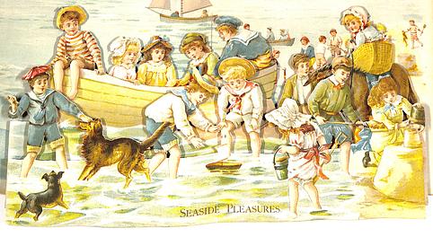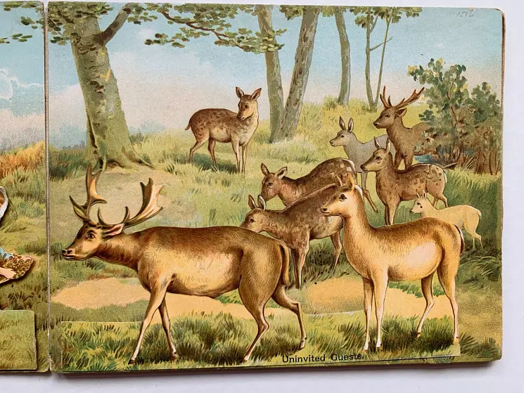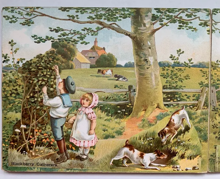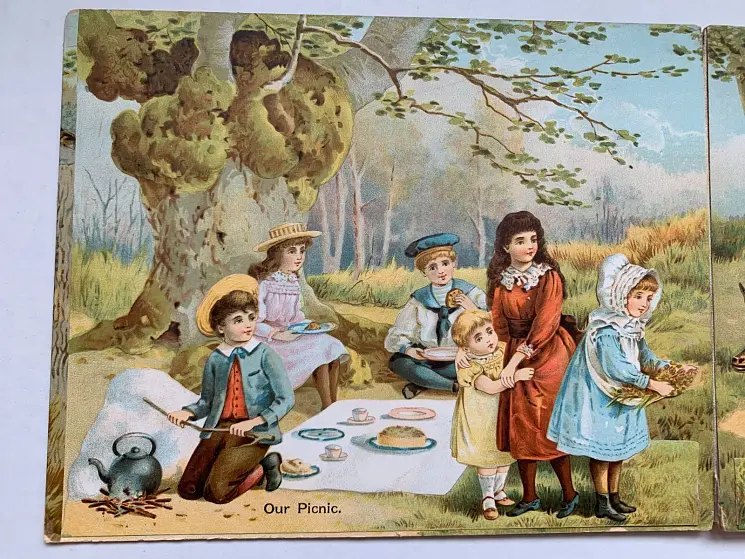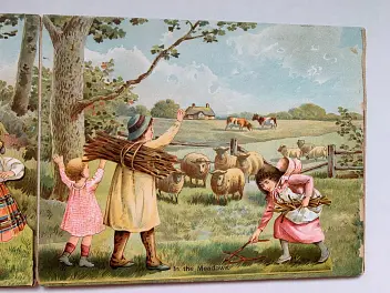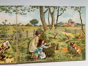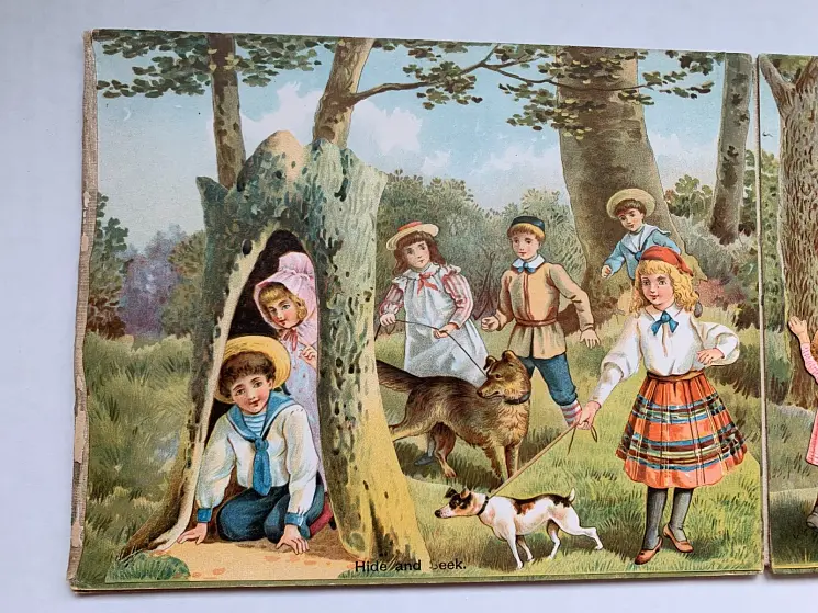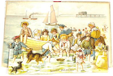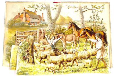 first edition 1895. printed in Saxony, pop-up mechanical book, pop-up images titles, FRIENDS AT THE FARM, SEASIDE PLEASURES