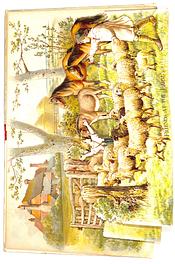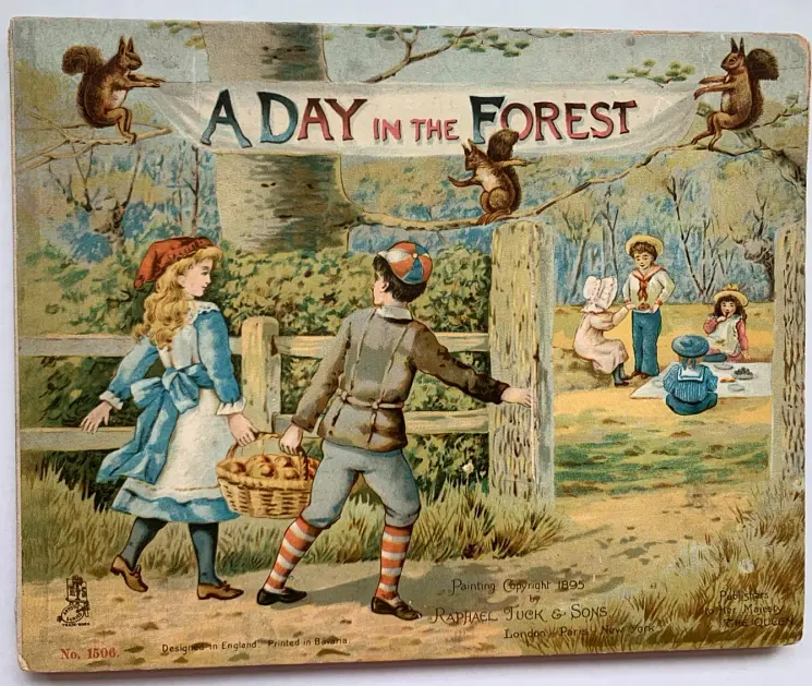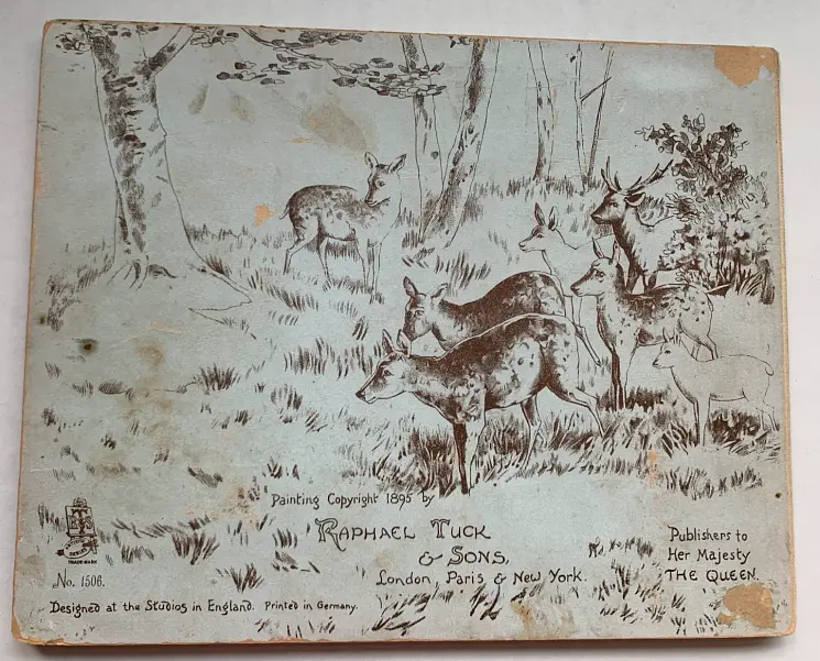 pictorial board covers with cream background and red cloth spine binding, contains four full page color images with pull tabs to move parts of the picture on back cover PAINTING COPYRIGHT 1895 BY RAPHAEL TUCK & SONS LONDON, PARIS & NEW YORK. PUBLISHERS TO HER MAJESTY THE QUEEN PRINTED IN GERMANY on front cover same tuck info but DESIGNED IN ENGLAND. PRINTED IN BAVARIA.