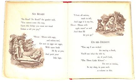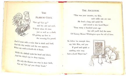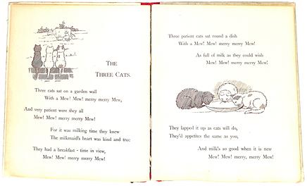 green cloth board covers with embossed title in gold and colored image below, title embossed in gold on spine, one page taped and repaired in this copy, frontispiece is titled WHERE ARE YOUR MITTENS, YOU NAUGHTY KITTENS?, gift inscription for 1911, 100 pages, WITH ONE HUNDRED AND SEVENTY DRAWINGS IN COLOUR AND MONOTONE, RAPHAEL TUCK & SONS, LTD. LONDON. PARIS. NEW YORK. PUBLISHERS BY APPOINTMENT TO THEIR MAJESTIES THE KING AND QUEEN ALEXANDRA,