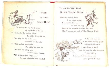 Titles of the pages are-OUR PICNIC, UNINVITED GUESTS, HIDE AND SEEK, IN THE MEADOWS, BLACKBERRY GATHERERS, THE PEEP SHOW BUNNIES AT PLAY