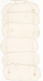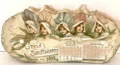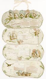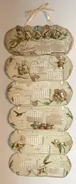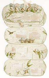 twelve fan panels connected at the base and with a ribbon, designed to spread out to make a fan, each panel has an image, a phrase, and a monthly calendar page, on reverse RAPHEL TUCK & SONS, LONDON, PARIS, AND NEW YORK. PUBLISHERS TO HER MAJESTY THE QUEEN. DESIGNED AT THE LONDON STUDIOS. PRINTED IN GERMANY