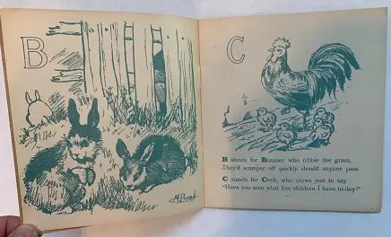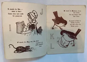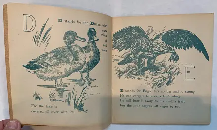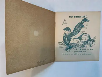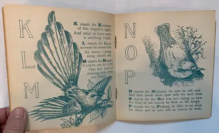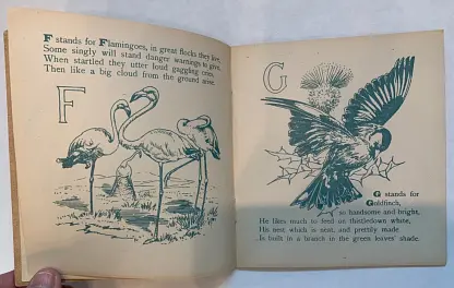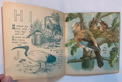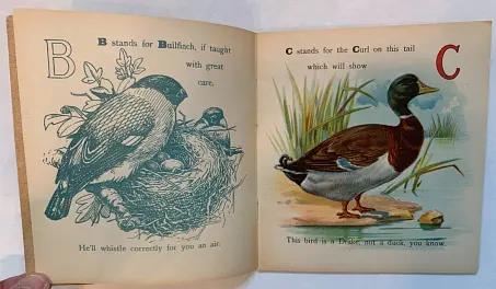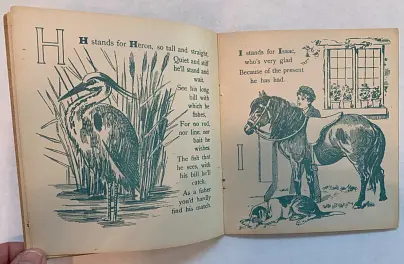 20 pages young child dressed in red holds ABC book in one hand and feeds a bird with the other