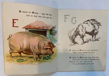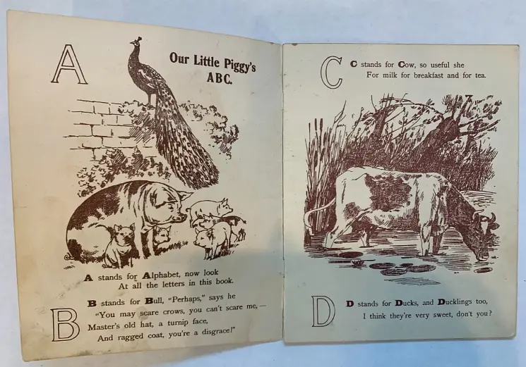 12 pages young child sits and holds book for pig to look at